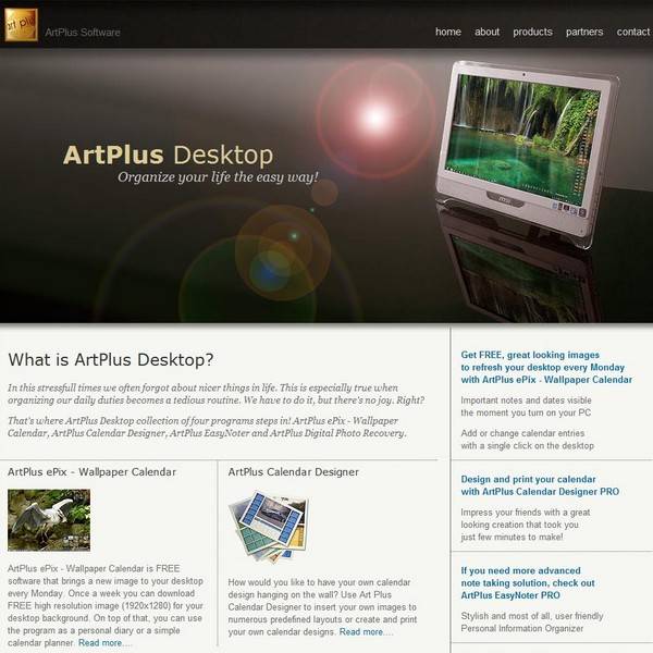 That's where ArtPlus Software collection steps in! ArtPlus ePix - Wallpaper Calendar, ArtPlus Calendar Designer, ArtPlus EasyNoter, ArtPlus Digital Photo Recovery, and more...